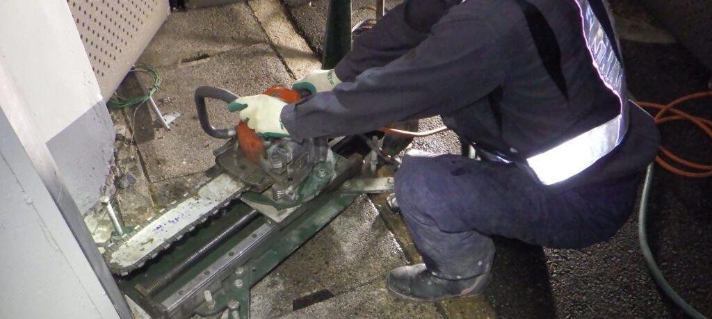 通常のチェーンソー手持ち施工では不可能な作業も、作業台を用いることで無事に既設柱を切断することが出来ます。