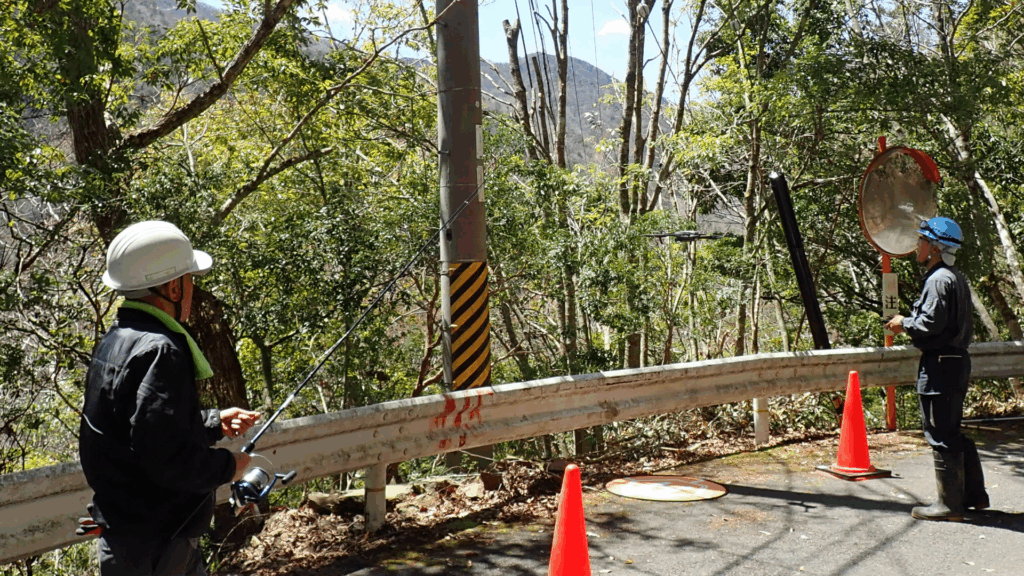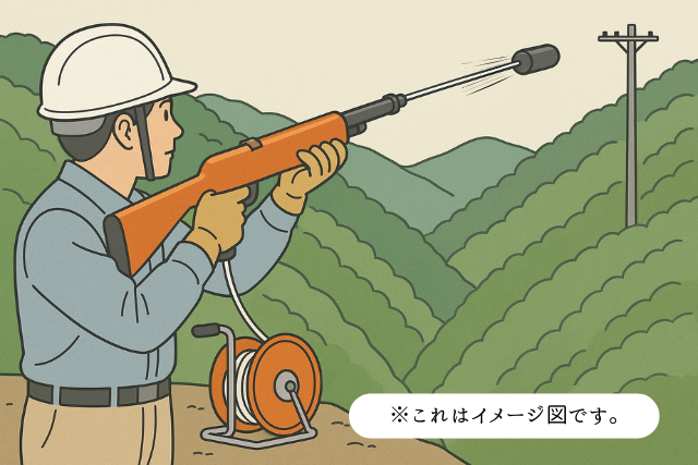 当時の早期復旧工事では、残った電柱間を谷越えでケーブル接続する必要があり、通線には『鉄砲』が使用されたと伺っています。