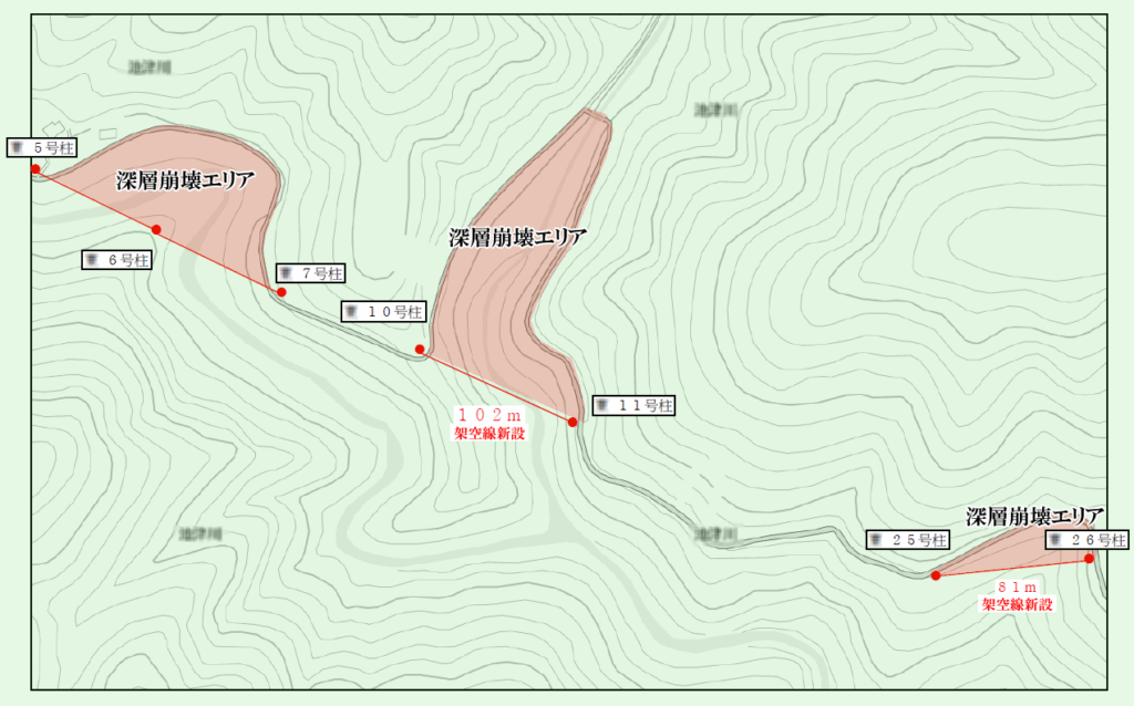 平成23年9月に発生した紀伊半島豪雨では、各地で広範囲の深層崩壊が発生し、道路沿いに建ち並んでいた電柱の一部が崩落、架空ケーブルが断線する大きな被害が生じました。