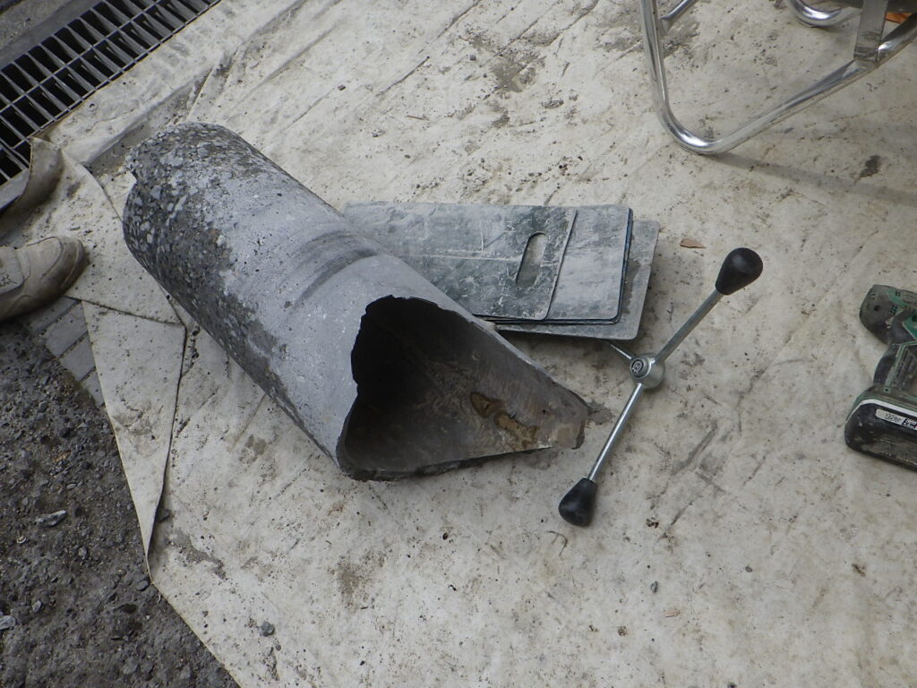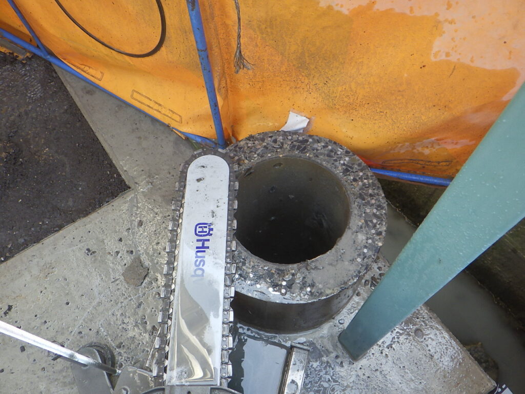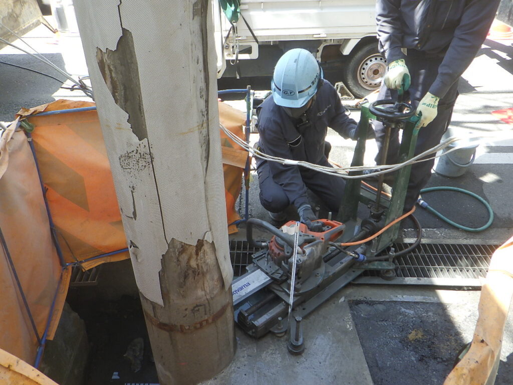 切断後もやはり内径が不足しており、設計上必要な鋼管柱をそのまま挿入することはできません。そこで、専用のコア開削機を用いて電柱内部を拡幅し、鋼管柱の寸法に適合するよう加工を行いました。